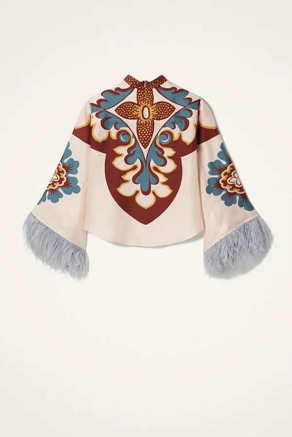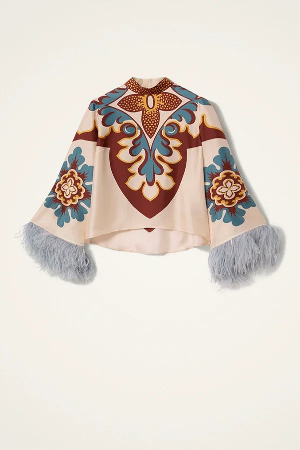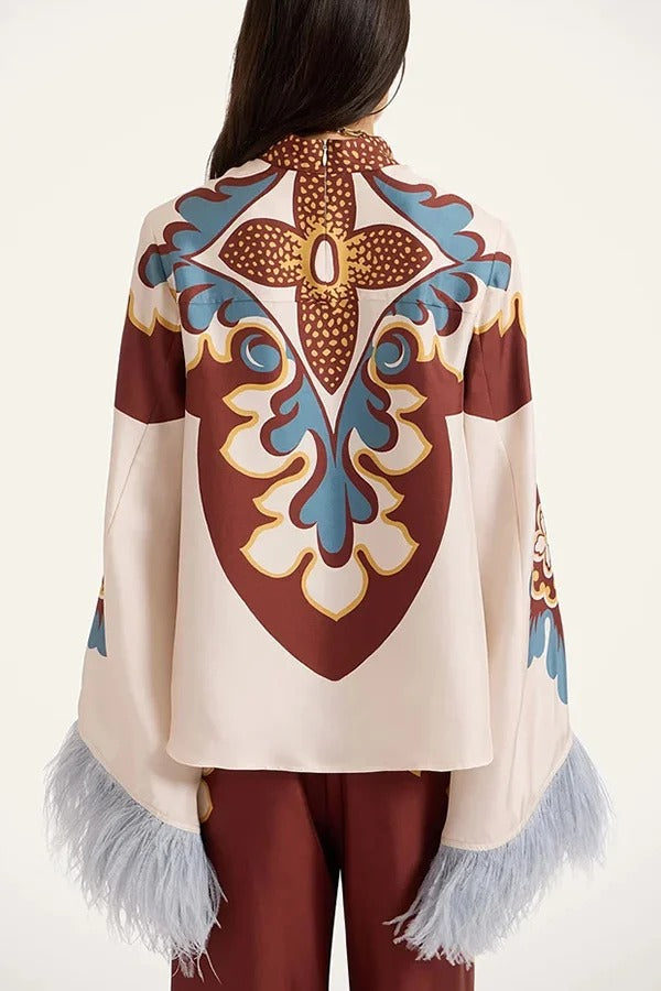 Bohemian Dreams Unique Print High Neck Feather Trim Bell Sleeve Top