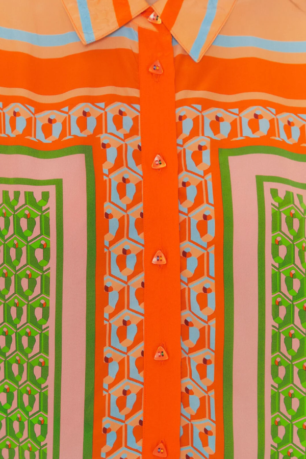 Embrace vibrant elegance with the Cashew Mix Long Sleeve Shirt, a mesmerizing dance of print and color that evokes Brazil's joyful spirit. Its bold cashew motifs are artfully placed against an array of geometric patterns, creating a harmonious clash that sings on the luxurious fabric. This piece features a classic collar neckline, anchoring the vivacious design, while the relaxed silhouette offers both comfort and a touch of sophistication.