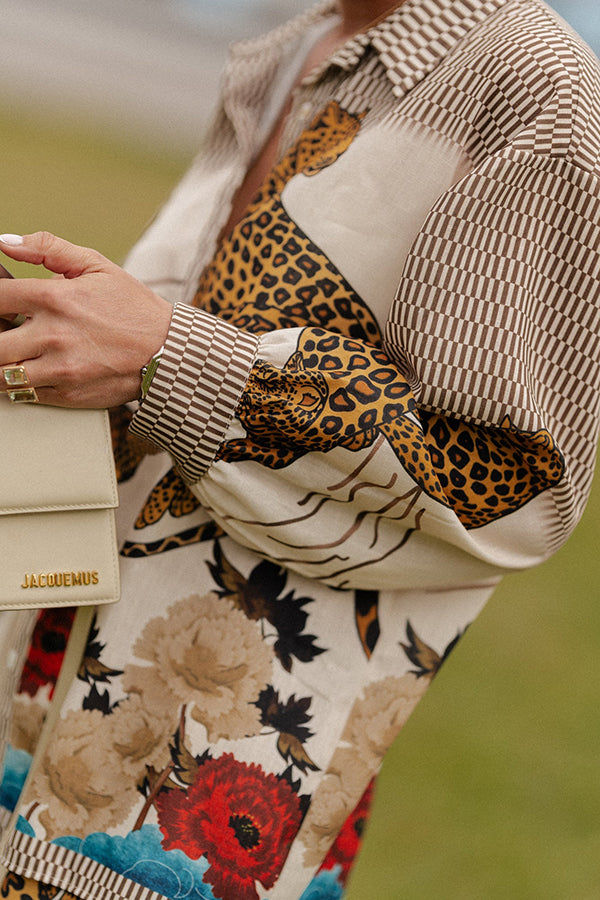 Exotic Leopard Flower Patchwork Print Button Down Oversized Blouse