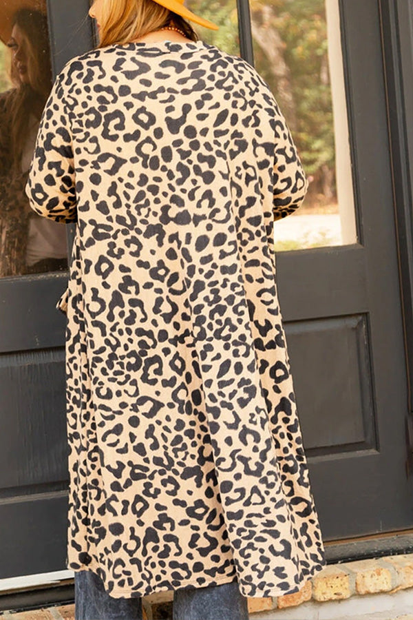 Leopard Plus Size Open Front Pocketed Long Cardigan