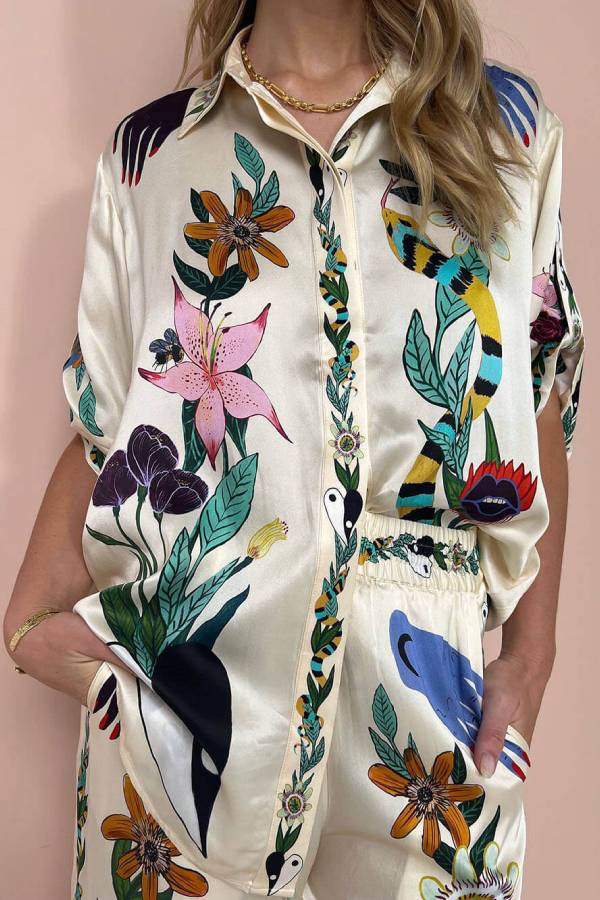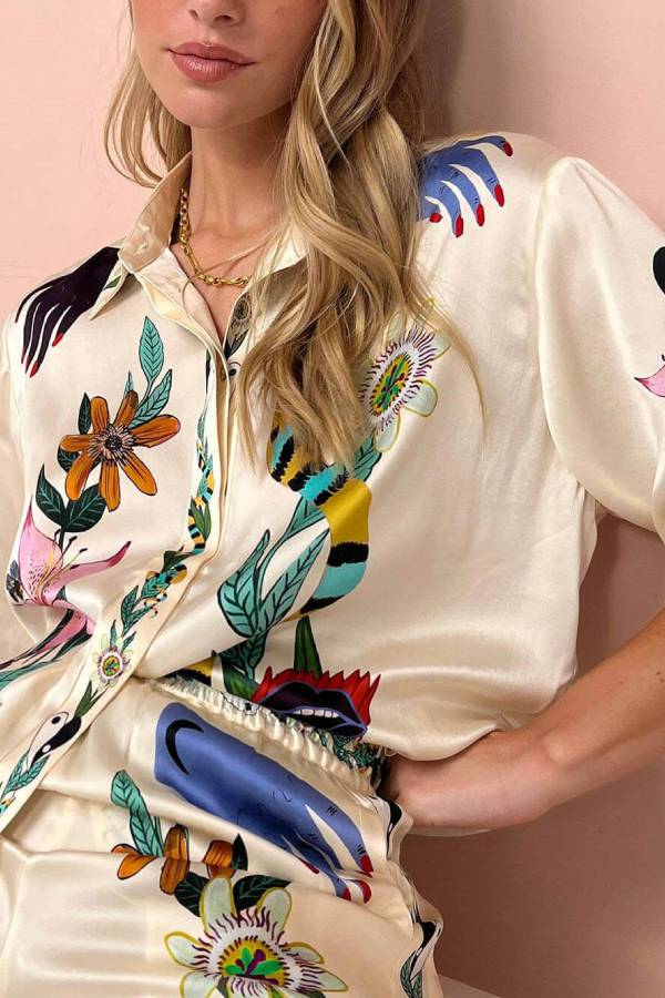 MODERN SOPHISTICATED FEEL SATIN UNIQUE PRINT BUTTON DOWN OVERSIZED BLOUSE