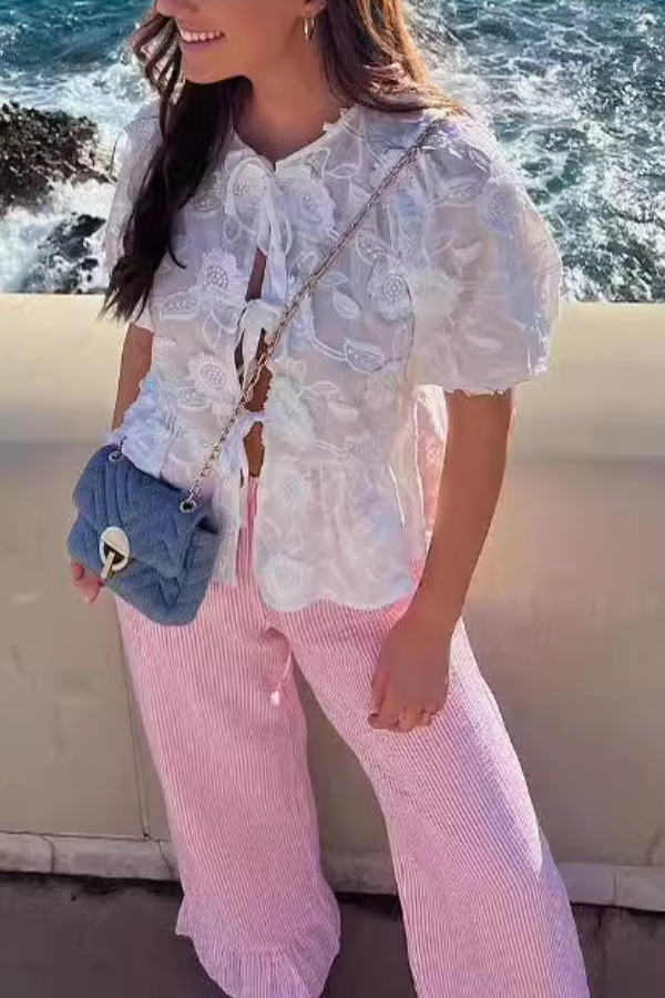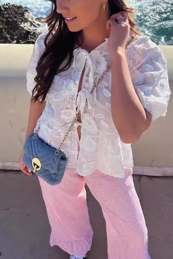 White Lace Design with Bow Tie Niche French Long-sleeved Shirt
