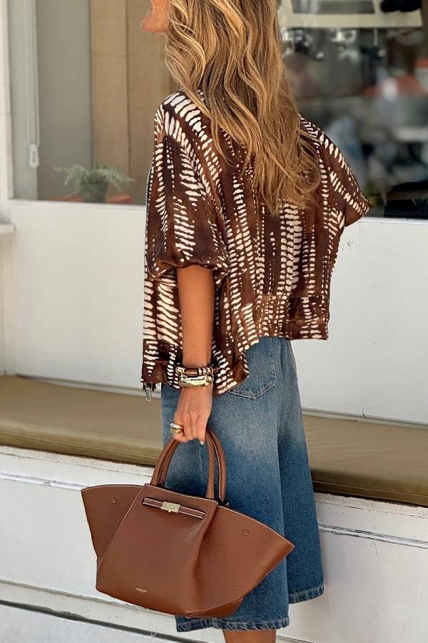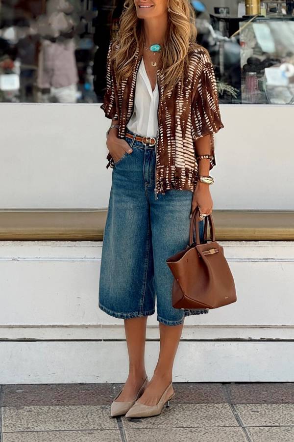 This jacket features a brown base with irregular white tie-dye stripes, creating a retro, artistic feel. The batwing sleeves create a relaxed, relaxed silhouette, the short length flatters the proportions, and the zipper closure allows for easy on and off. Made from lightweight, breathable fabric, it's perfect as a sun-protective outerwear piece in spring and summer, or as a layering layer in fall and winter. Paired with jeans or a skirt, it easily creates a laid-back, vacation vibe or a casual urban look, making it a striking piece that elevates any outfit.