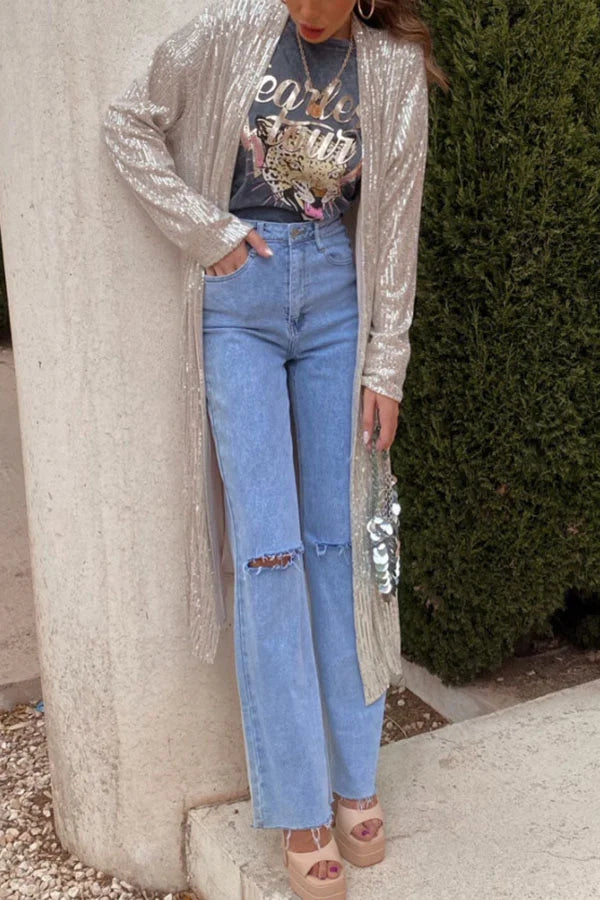 Shine Bright Sequin Long Sleeve Open Front Drape Midi Kimono