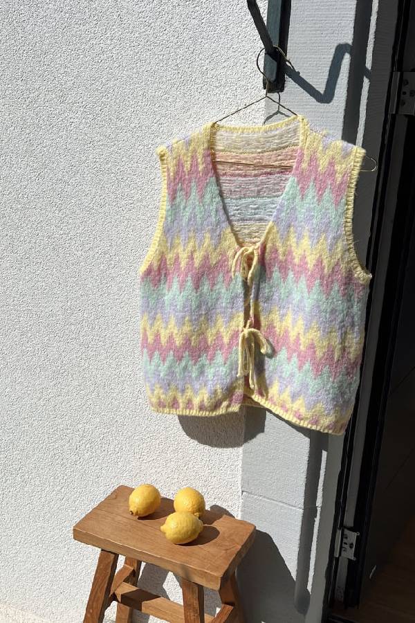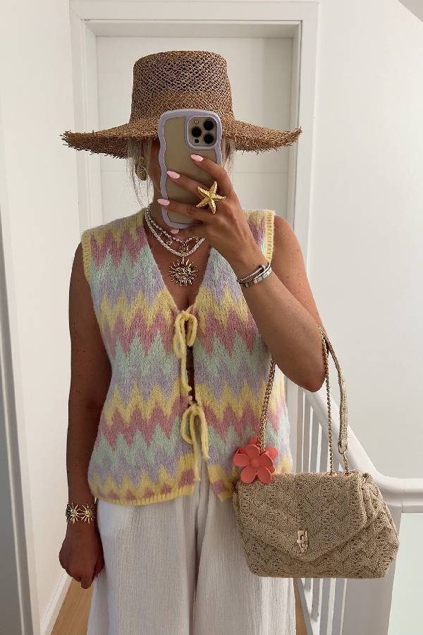 Add a touch of cheer to your wardrobe with this sleeveless sweater with zigzag stripes in a pastel hue. This colorful retro cardigan, embellished with a bow on the front, is perfect for adding a pop of color to any summer look. Why do we love it? Its vibrant pattern and soft knit fabric make it both comfortable and stylish.
