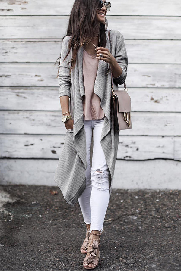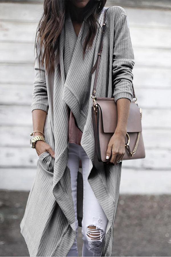 Light Grey Waffle Knit Drape Front Long Cardigan