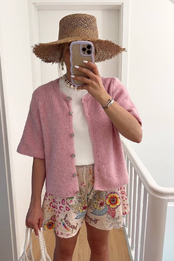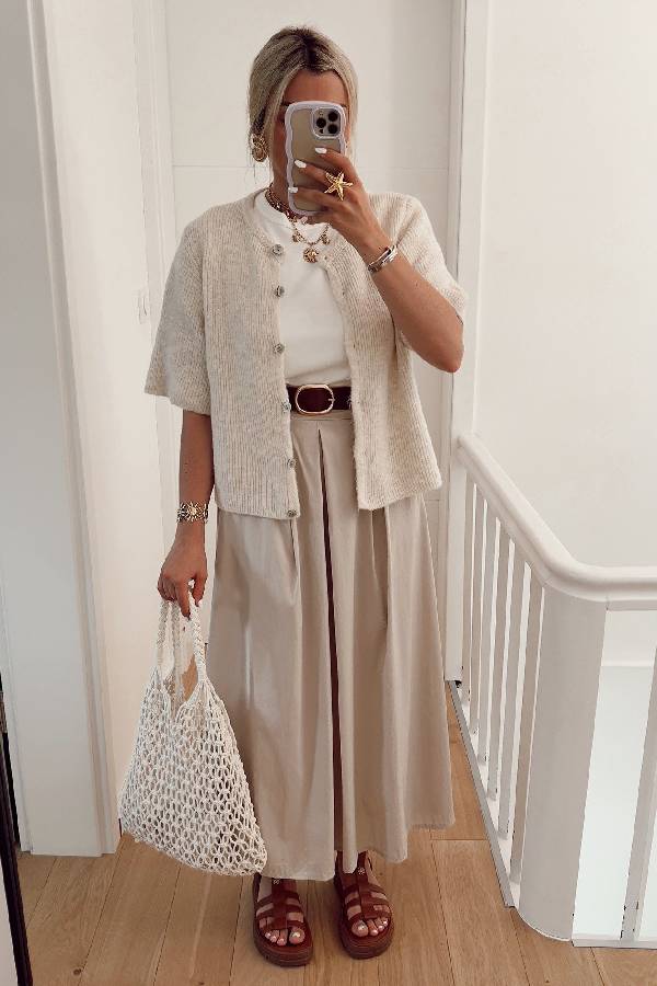 Pair this knit cardigan with floral print shorts and a white top for a casual yet feminine summer look. Accessorize with a straw hat and macramé bag for a bohemian vibe. Add gold accessories like a sun bracelet and starfish earrings for an elegant touch. This cardigan is perfect for cool summer evenings, beachside walks or casual outings in the city.