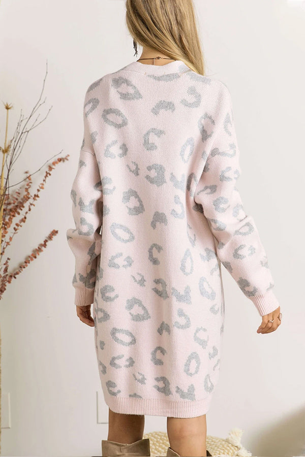 Pink Leopard Side Pockets Open Front Long Cardigan