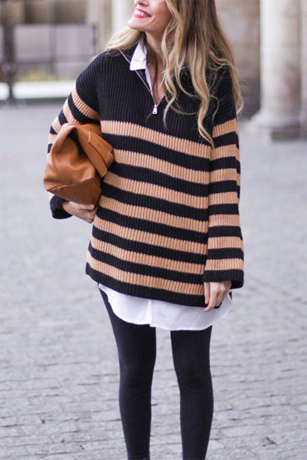 Quarter Zip V Neck Ribbed Knit Striped Pullover Sweater