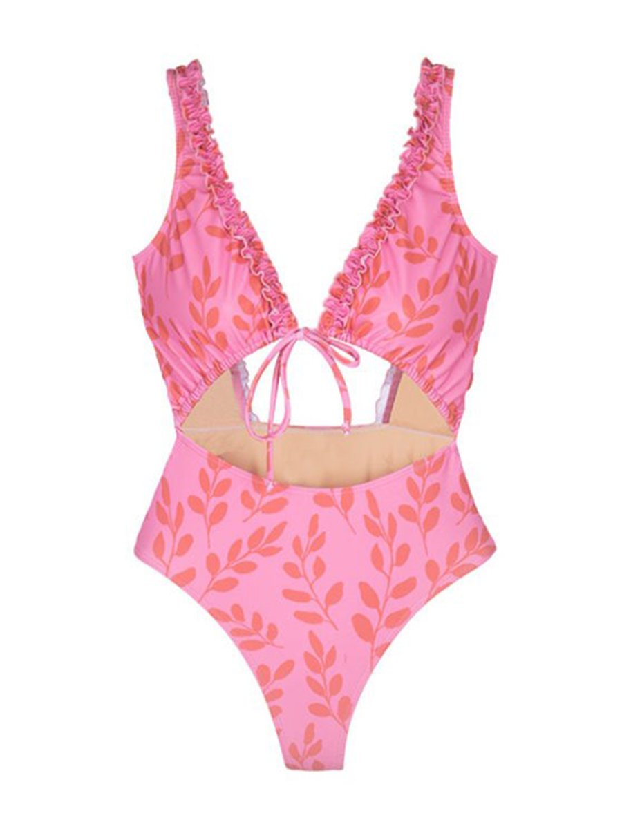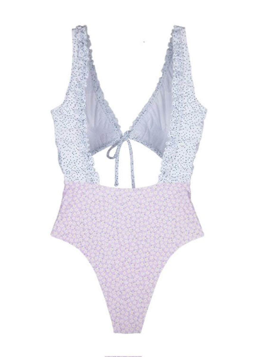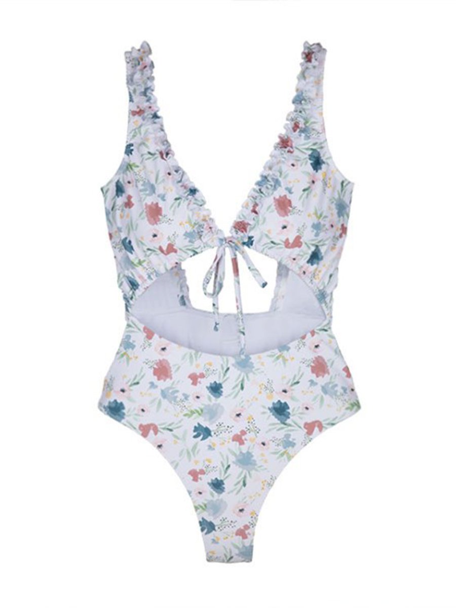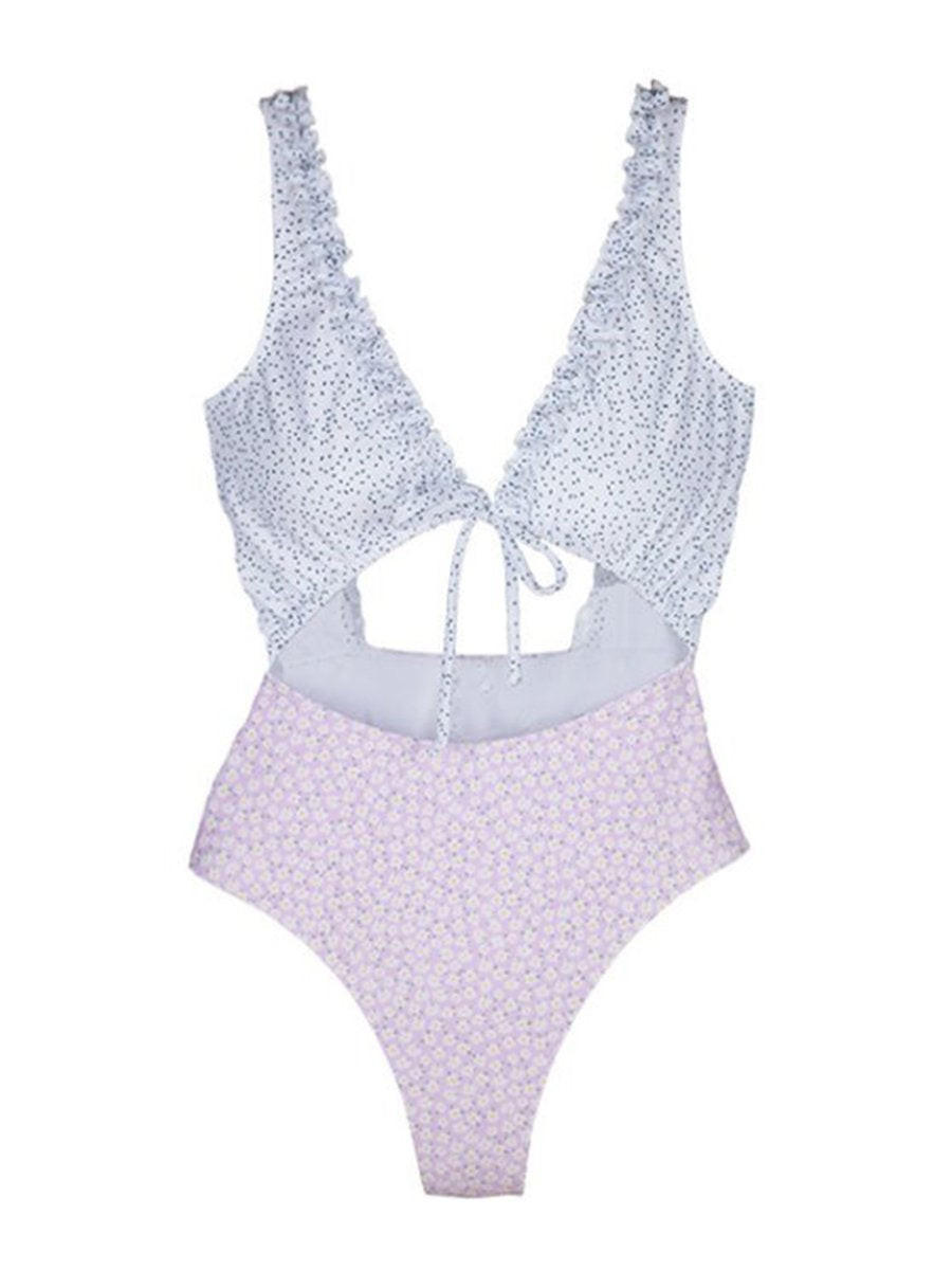 Floral Print Hollow Lace-Up One-Piece Swimwear