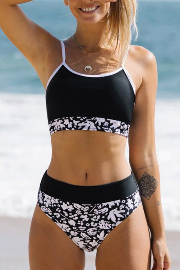 Floral Printed Patchwork Black Tankini Bikini Set