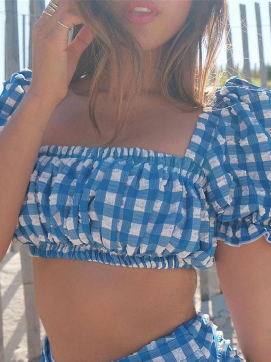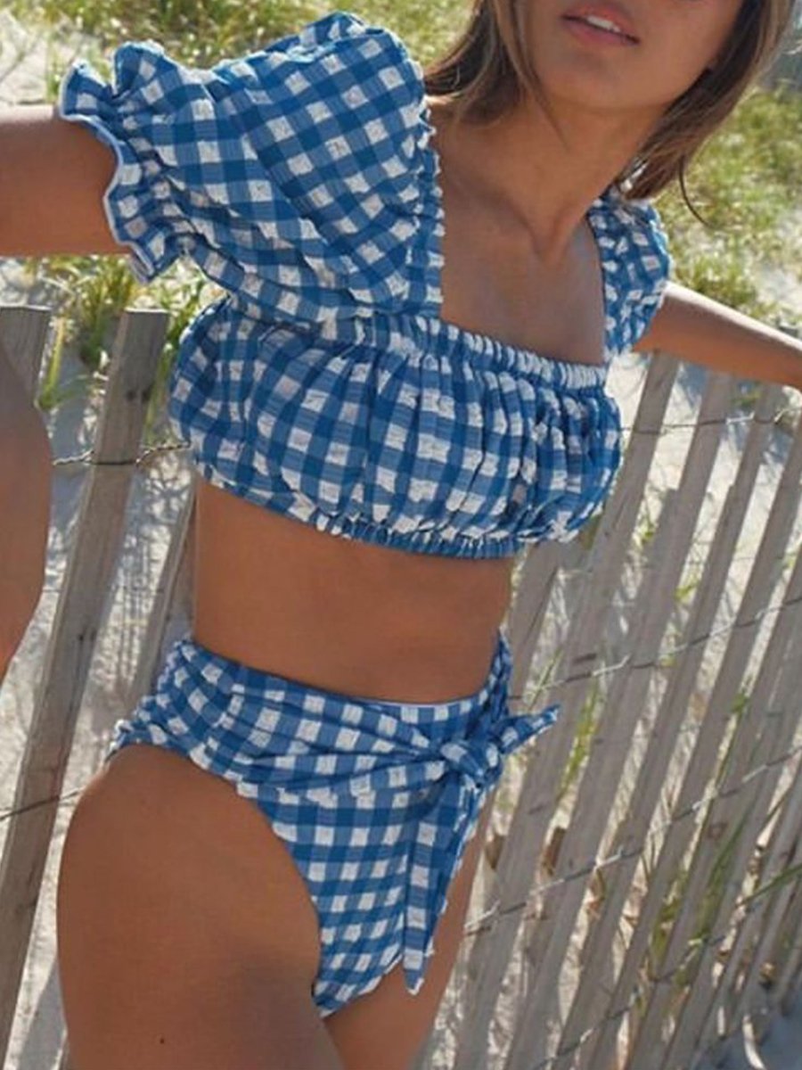 Stay cool in this Grid Blue Bikini Set. Classic print, ruffled design on the shoulder adds more fun of it.