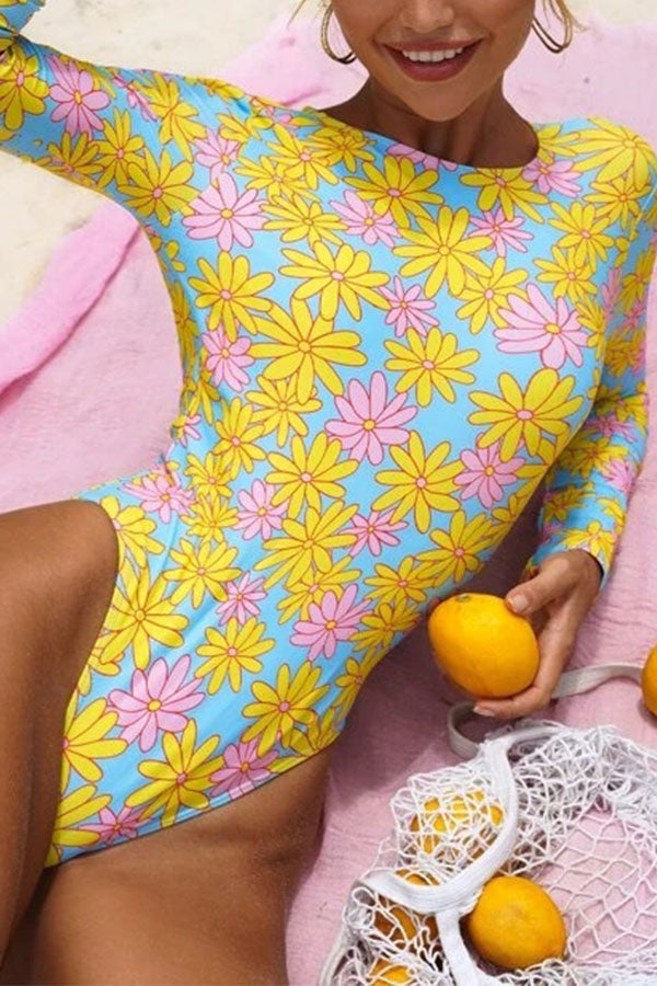 Long Sleeve Printed Sexy Floral One-Piece Swimsuit
