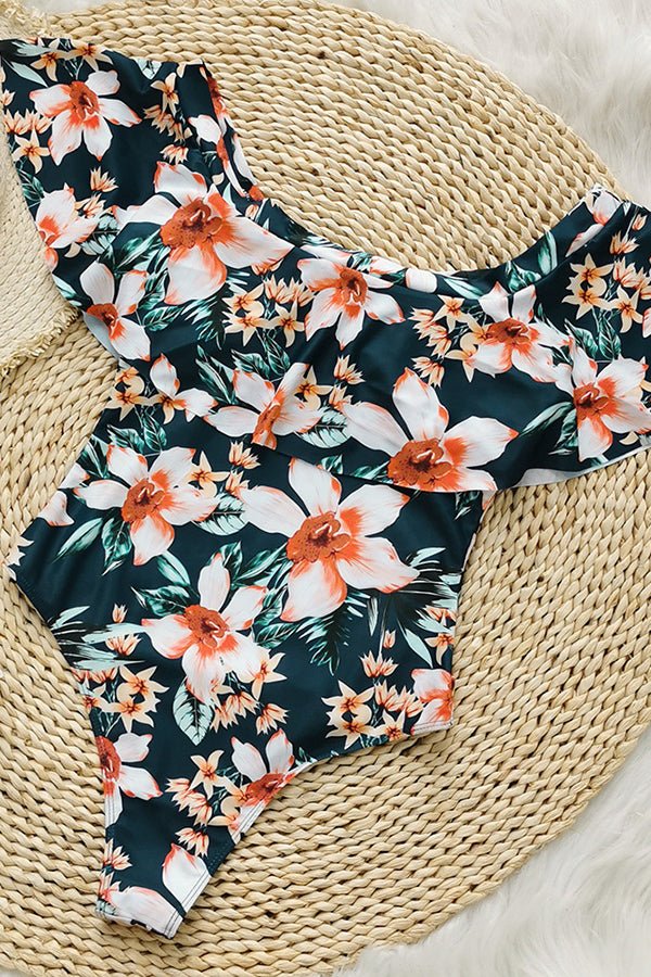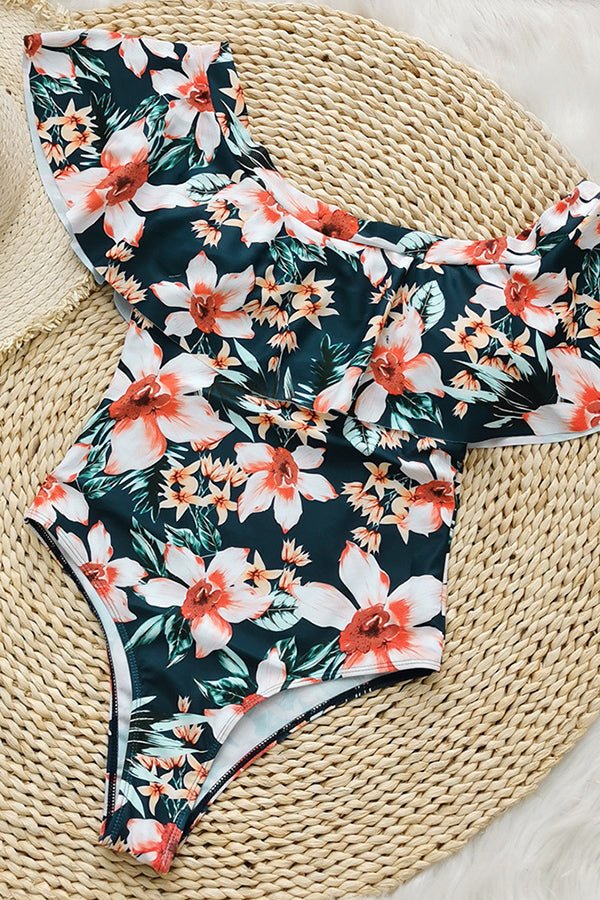 Off-Shoulder Ruffle Print One-Piece Swimsuit