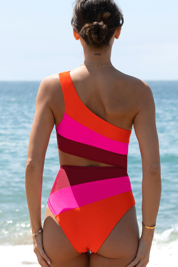 One Shoulder Color Block Cutout One Piece Swimsuit
