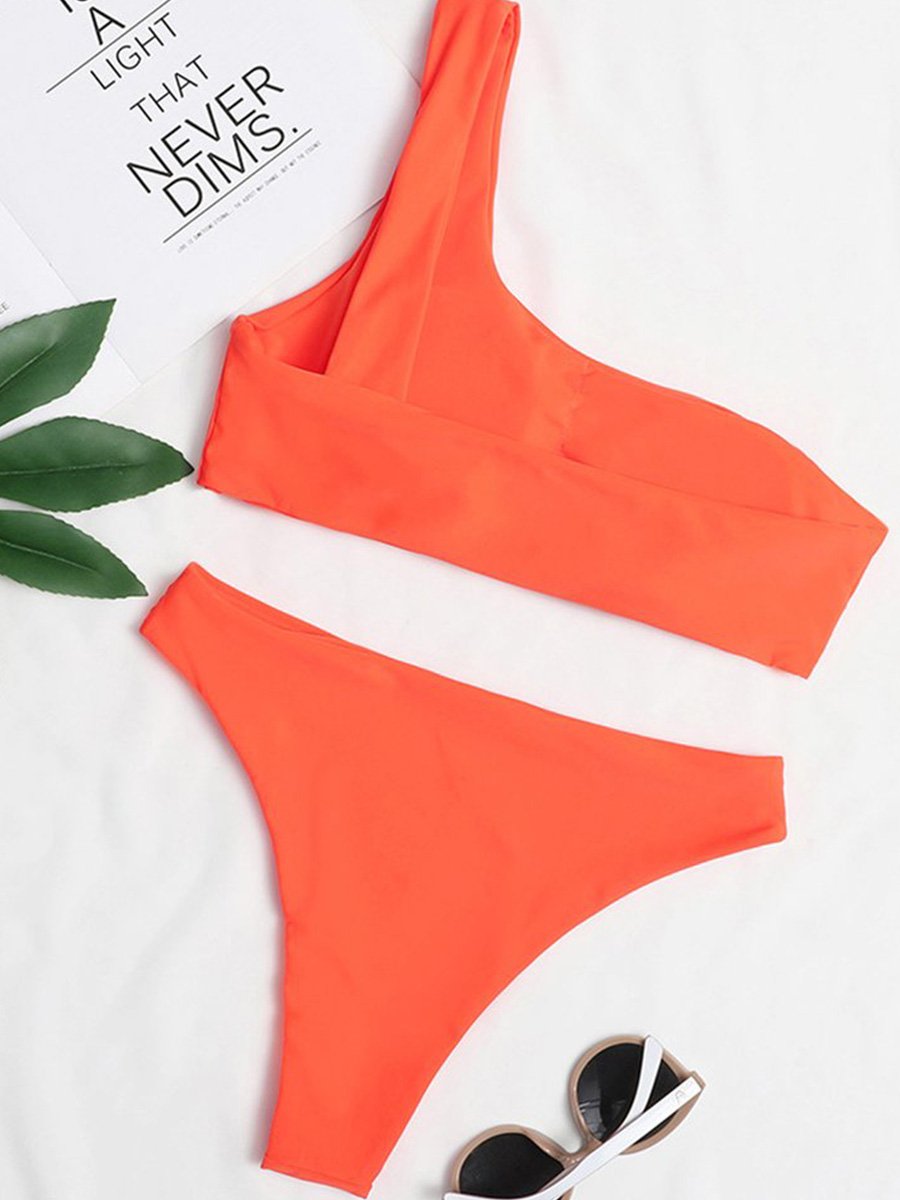 One Shoulder Solid Two Pieces Swimsuit (2 Colors)
