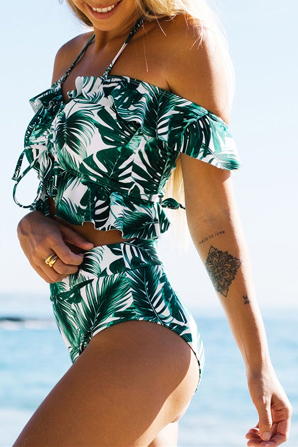 Printed Ruffled Drawstring Off-shoulder Bikini
