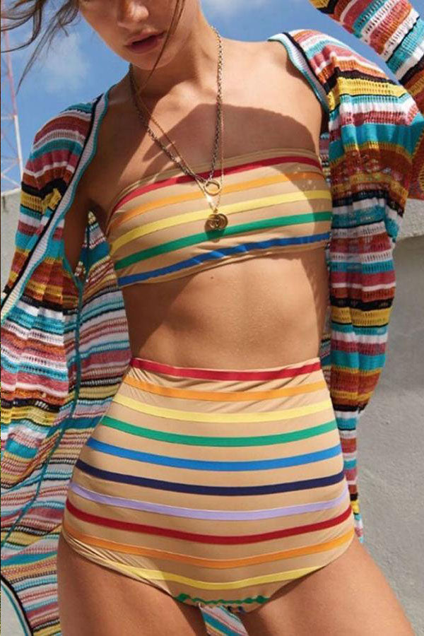 Rainbow State Stripe Print High Waist Bikini Swimsuit