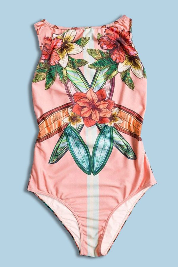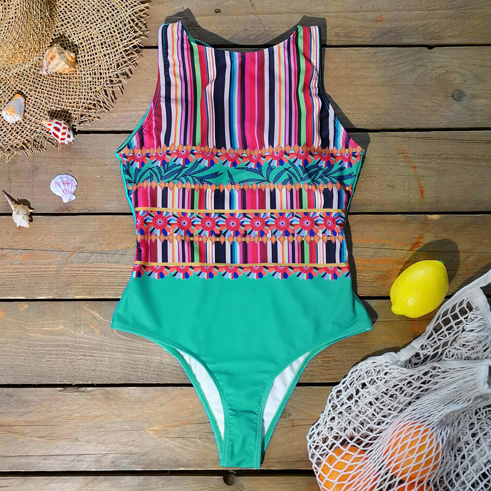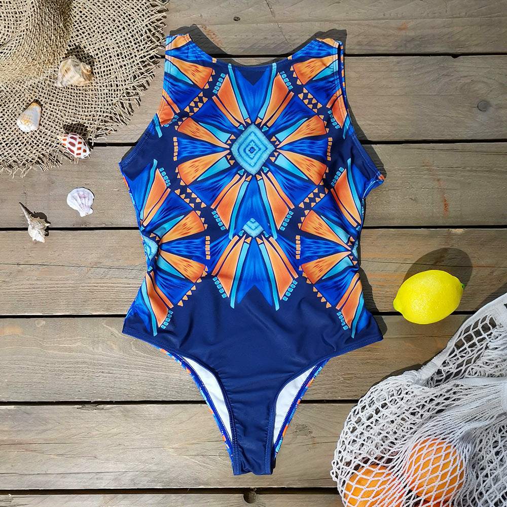 Round Neck Ethnic Print Open Back One-piece Swimsuit