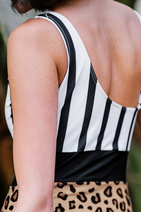 Sling Asymmetric Collar Striped Leopard Print High Waist Triangle Swimsuit