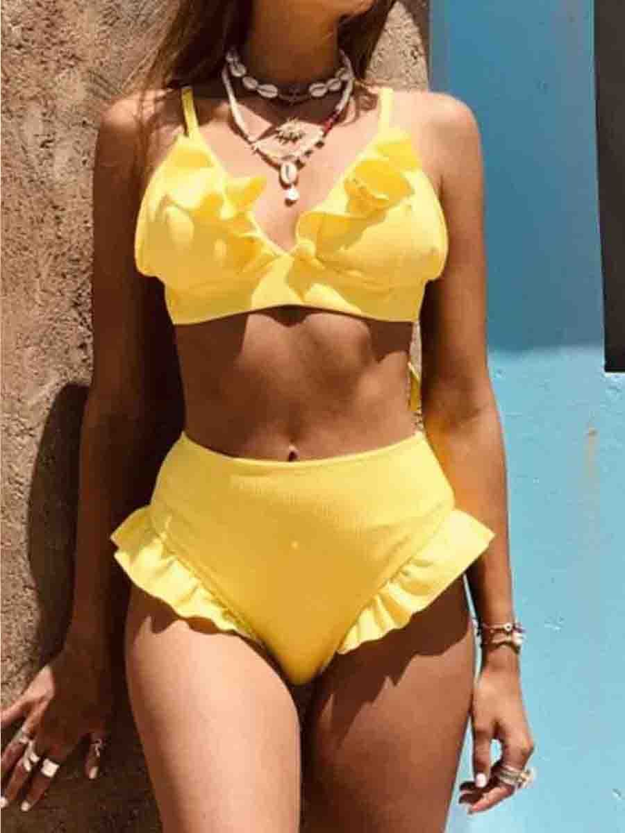 Spaghetti Strap Flounce Design Solid Two Pieces Swimsuit (3 Colors)