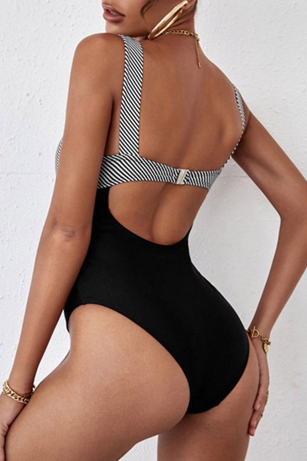 Striped Stitching Solid Color Lace One-piece Swimsuit