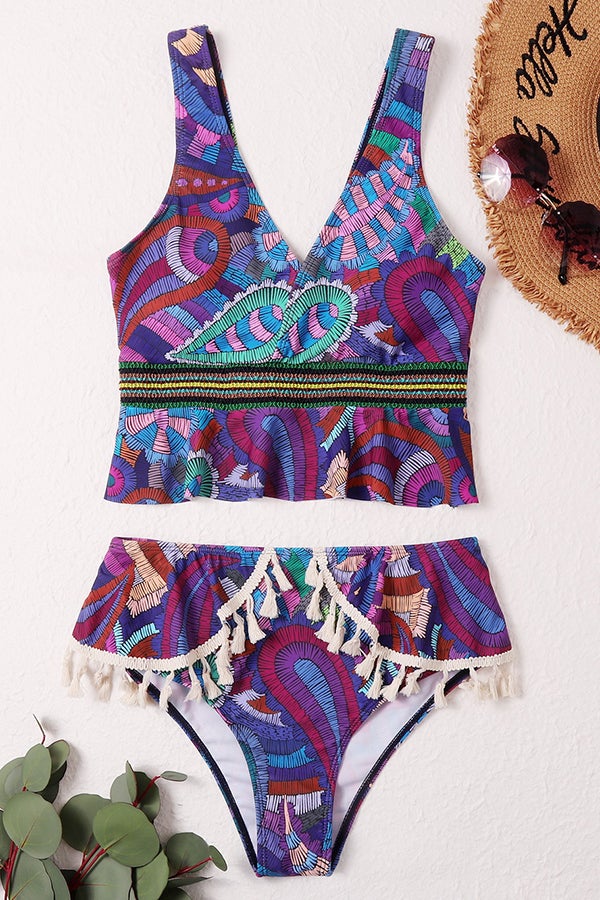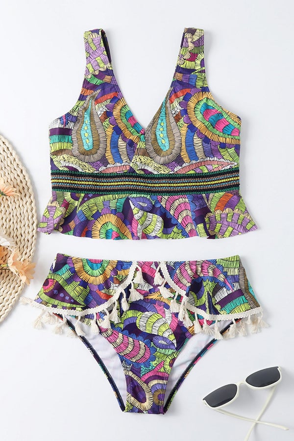 Summer Escape Ethnic Print Fringed Bikini Swimsuit