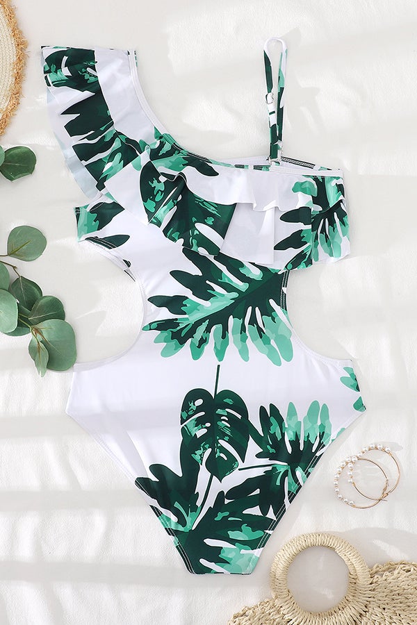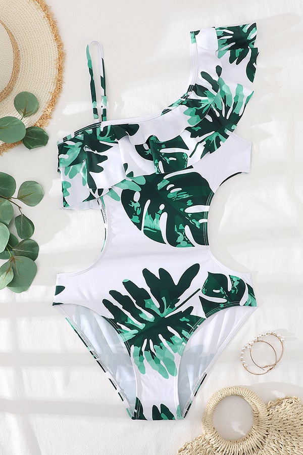 Asymmetric Printed Ruffled One-piece Swimsuit