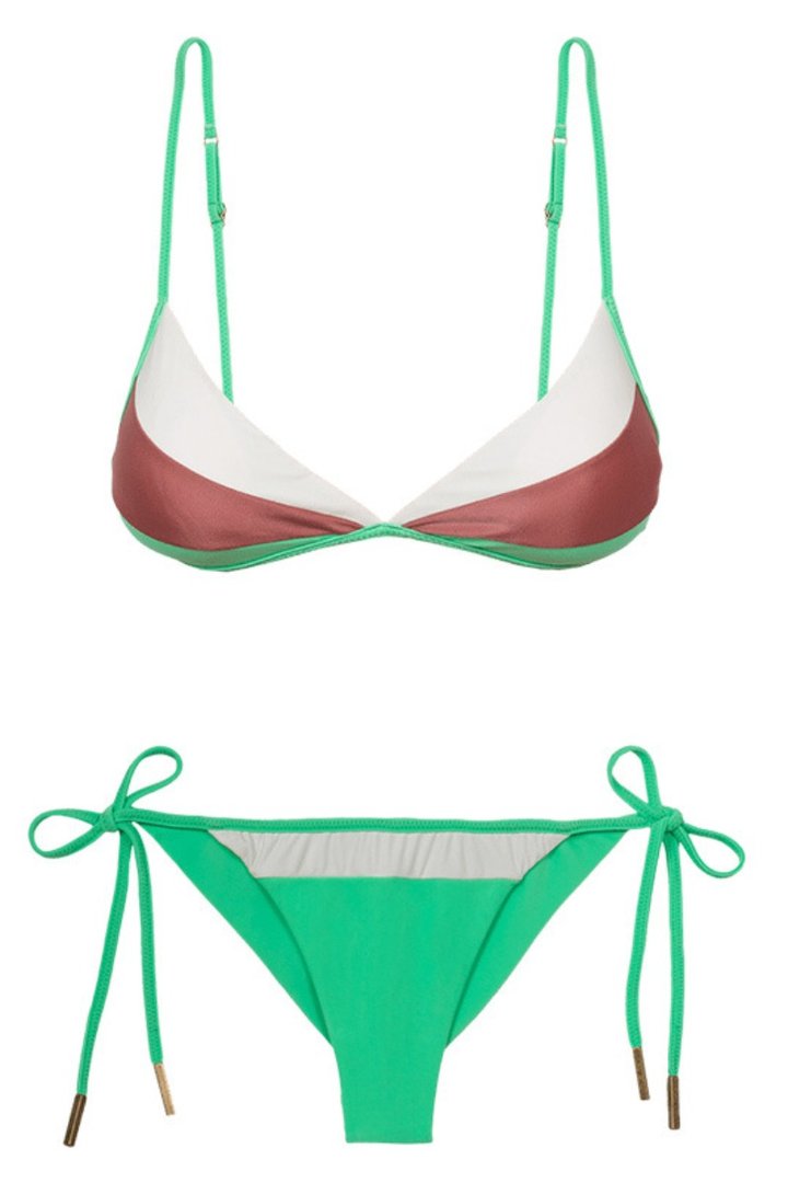 Simple but so chic, this  Backless Color-lump Patchwork Bandage Green Bikini Set is a must have for your vacation.
