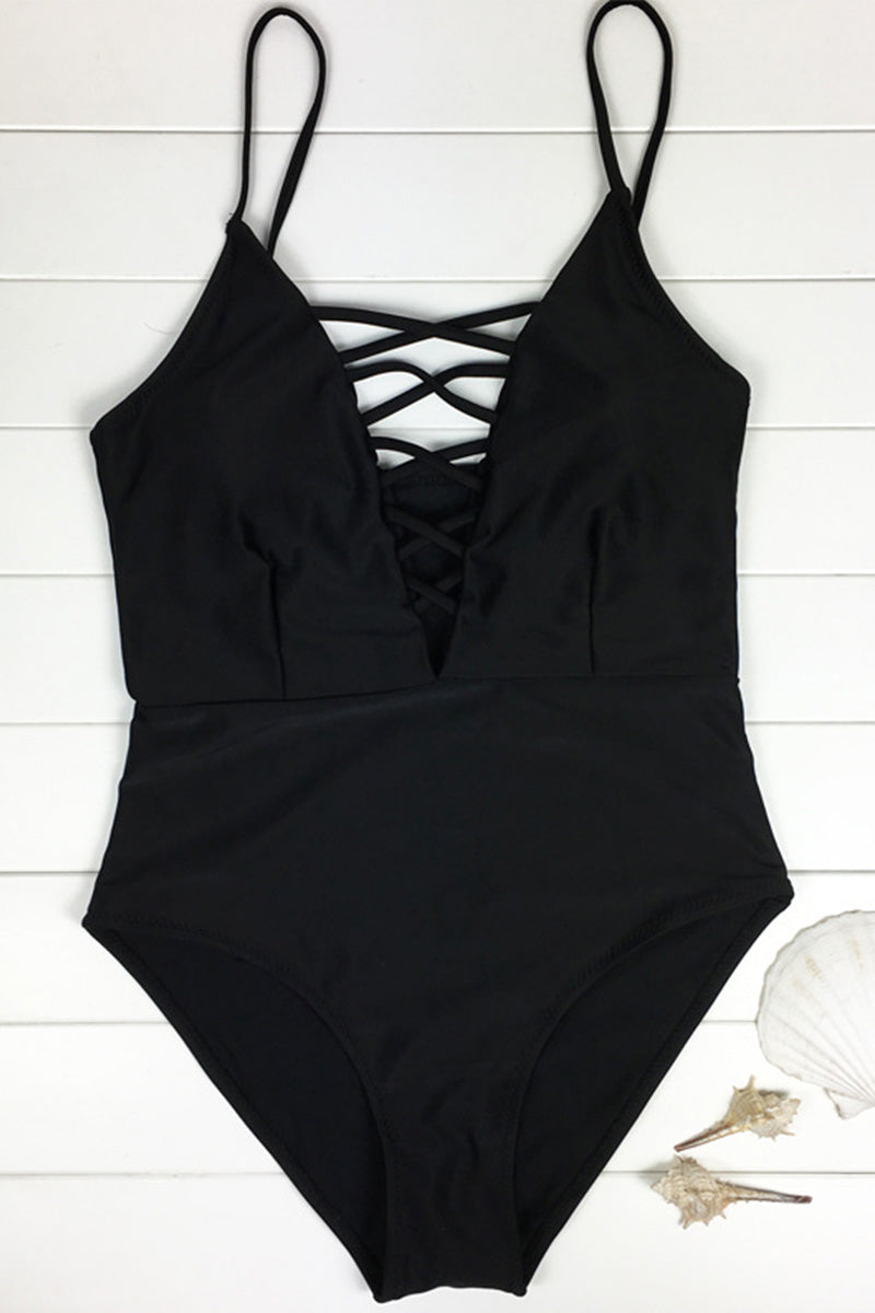 Spaghetti Strap Hollow-out Black One-piece Swimsuit